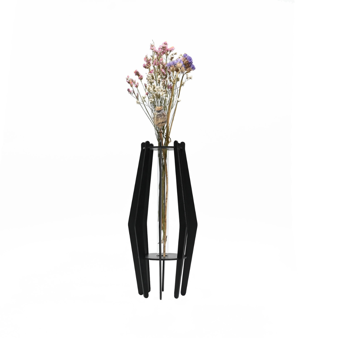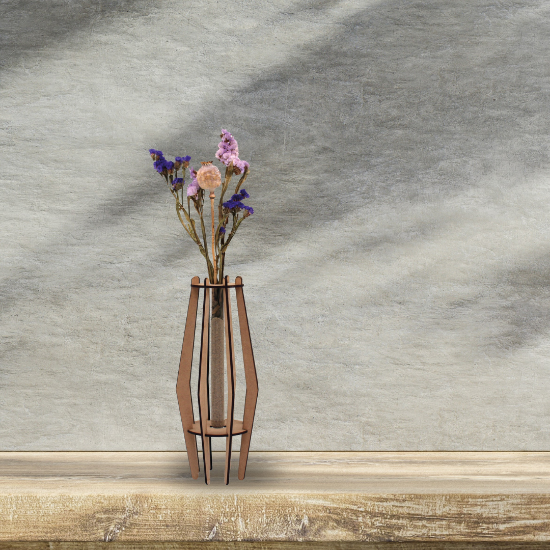 Seine einzigartige Form setzt einen modernen Akzent, der zu vielen verschiedenen Inneneinrichtungen passt, vom skandinavischen Minimalismus bis zum warmen Industriestil. Der Holzrahmen hält ein Reagenzglas aus Glas, sodass Sie Blumen oder Zweige wunderschön präsentieren können.